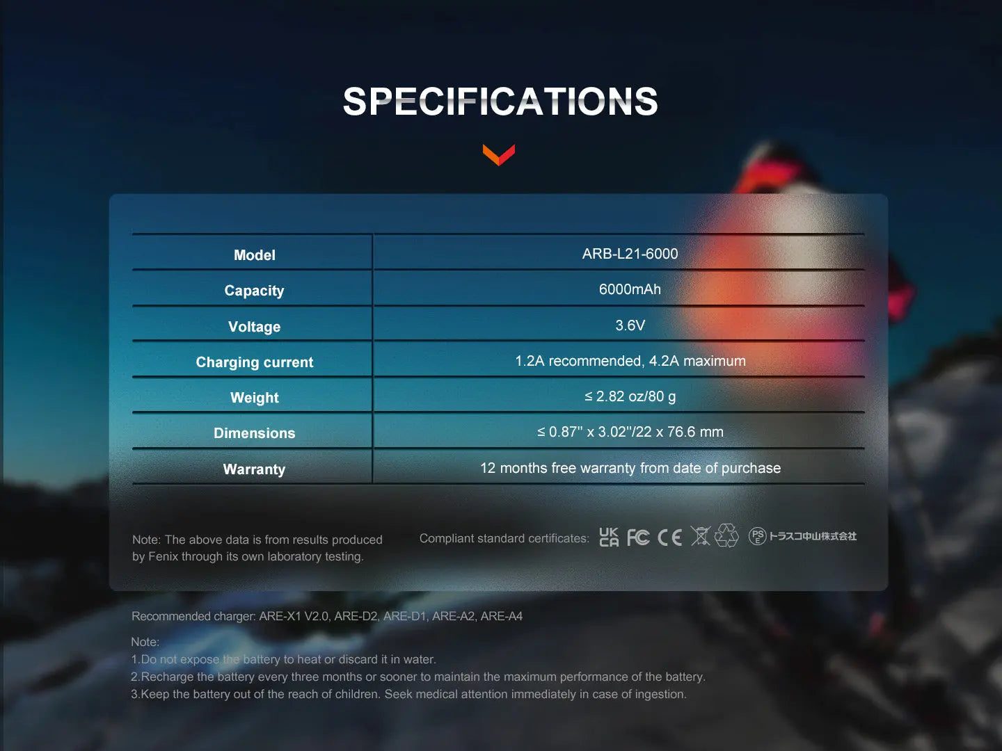 The Fenix ARB-L21-6000 21700 rechargeable Li-ion battery has a capacity of 6000mAh, providing the necessary voltage and power for long-lasting use and increased lumen capabilities. With the same features as other high-quality Fenix batteries, such as internal protective circuits and up to 500 charging cycles, the ARB-L21-6000 can ensure extended runtime and consistent performance. It also offers three sets of overheat protection - pressure relief, microporous, and PTC cathodal block - to maintain the battery's safety and stability. Never be without light; order a spare 21700 battery today.